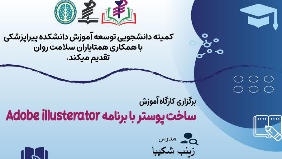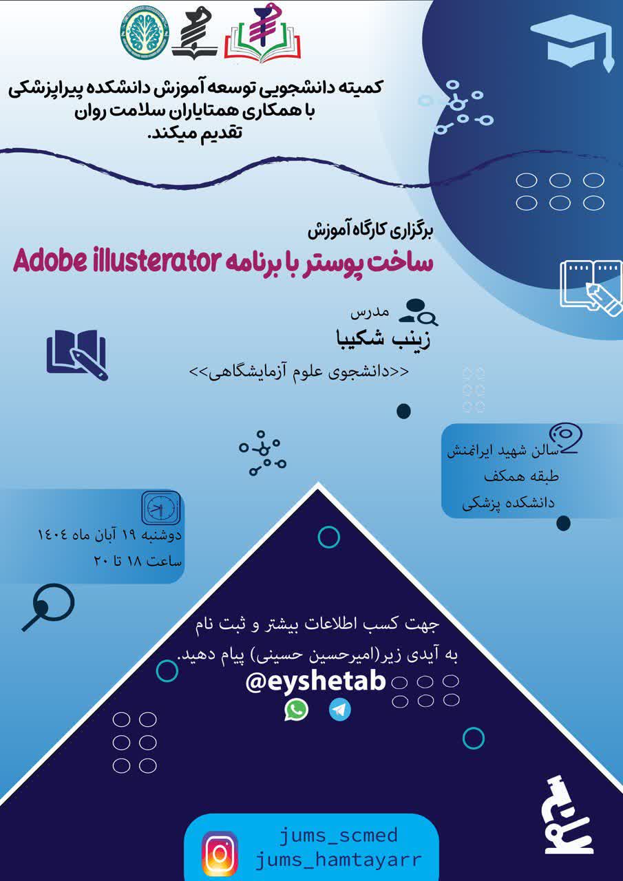 کارگاه آموزش ساخت پوستر ( با برنامه Adobe illusterator ) با تدریس سرکار خانوم زینب شکیبا در روز دو شنبه ۱۹ آبان ماه ساعت ۱۸ الی ۲۰ در سالن ایرانمنش طبقه همکف پزشکی برگزار میگردد .