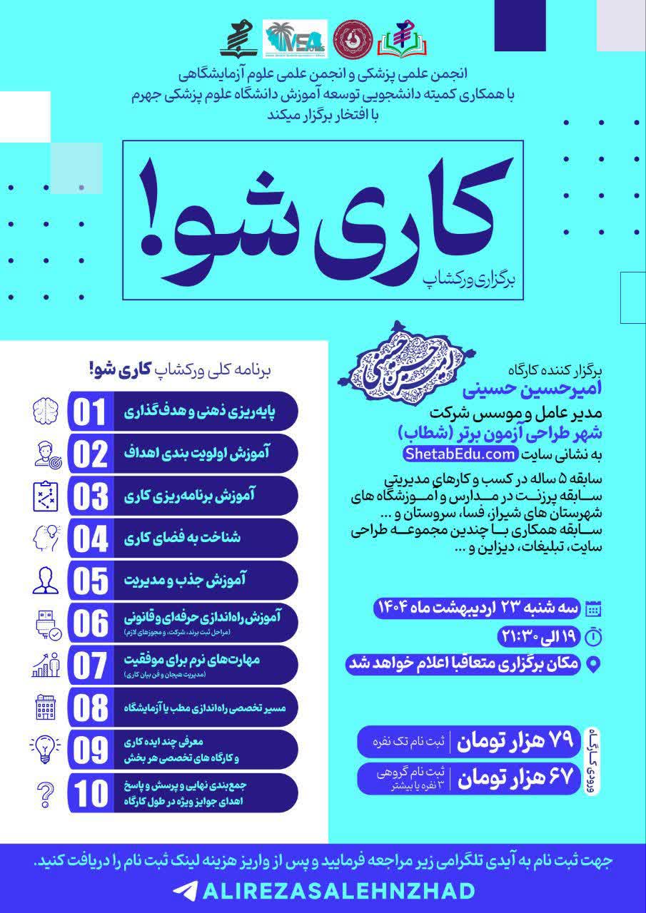 جهشی هوشمندانه بهسوی آینده کاری! در دنیای امروز، تنها دانستن کافی نیست… باید بلد باشی چطور خودتو بسازی، مسیرتو پیدا کنی و بدرخشی! “کاری شو” یه ورکشاپ متفاوت برای اونهایی که میخوان از سردرگمی بیرون بیان، ایدههای کاریشون رو بسازن، و توی مسیر درست، حرفهای حرکت کنن! ⸻ برگزارکننده: امیرحسین حسینی • مدیرعامل و موسس شرکت شطاب (شهر طراحی آزمون برتر) ShetabEdu.com • ۵ سال تجربه در کسبوکارهای مدیریتی (مجازی و حضوری) • مدیریت اجرایی در آموزشگاههای مطرح کنکوری شیراز • سابقه پرزنت در مدارس و آموزشگاههای شیراز، فسا، سروستان و… • همکاری با مجموعههای طراحی سایت، تبلیغات و برندینگ